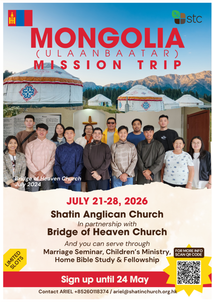 We will be going to Ulaanbaatar, Mongolia for a Mission Trip this summer, July 21-28. Sign up by May 24! If you are interested contact ariel@shatinchurch.org.hk for more information.