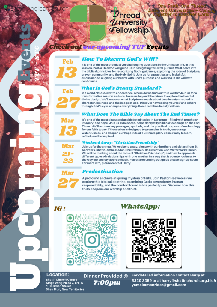 Thread University Fellowship (TUF) is a growing community of university students of Shatin Anglican Church.  We gather twice a month for food, fellowship, and for discussion over tough topics we are exploring as Christians and seekers.  Past topics have included: How can God send people to hell?  Does Christianity denigrate women?  What exactly is the Trinity?
